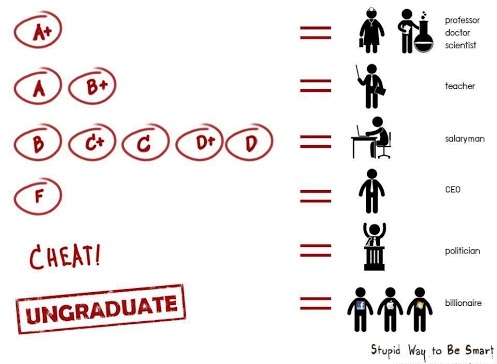 Jinak motivaci by vam nemely byt penize (statisticky to totiz nevychazi), ale moznost rozhodovat sam za sebe, rozsirovat si obzory, nabrat zkusenosti a kontakty z realneho sveta a zvysit si tak vyznamne sanci delat co vas bude bavit (at jako zamestnanec, tak jako podnikatel). A navic, podle teorie na obrazku byste museli ze skoly odejit, abyste se stali milionarem 😉