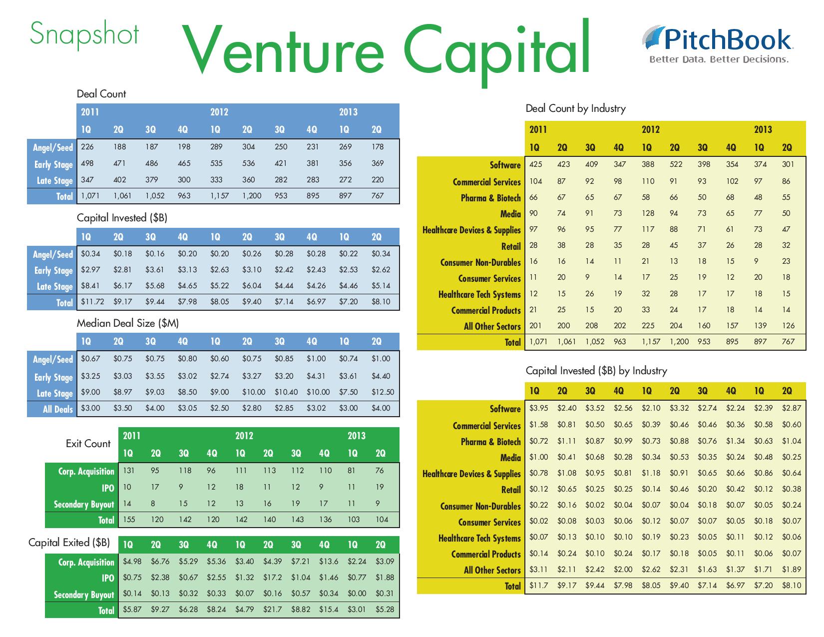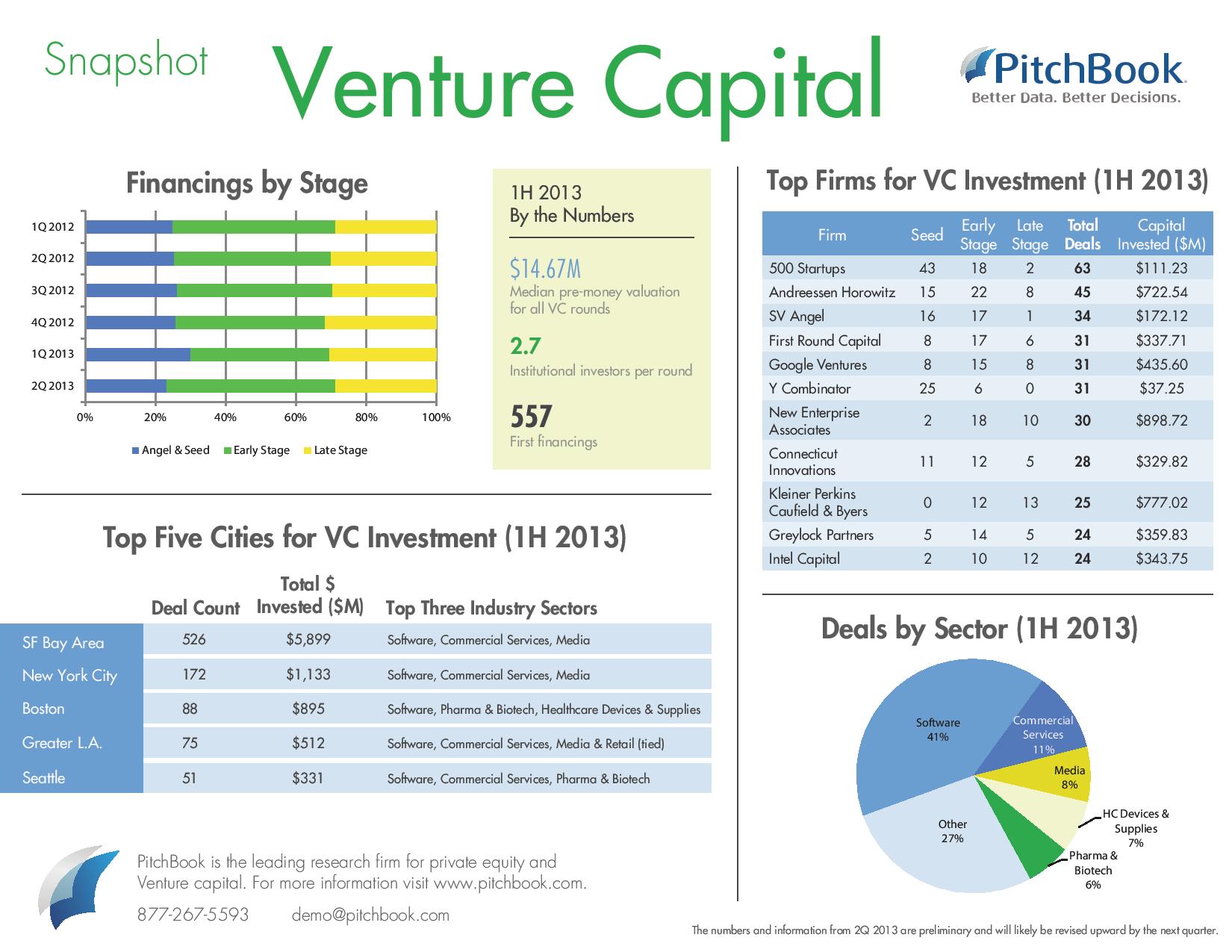 PitchBook has released an early look at 2Q 2013 and first half venture capital investment statistics. Some highlights include: